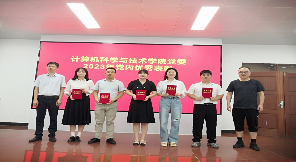 院党委副书记、副院长、纪委书记韩军书通报了学校2022年度综合考核结果,其中,计算机科学与技术学院党委获2022年度基层党建考核“优秀”等次,学院党委书记单桂锋获2022年度基层党组织书记抓党建述职评议考核“好”等次,学院获“完成教育教学类突出贡献指标单位”,夏成龙辅导员综合考核优秀;通报了学院党委关于表彰先进党支部(学生第四党支部)、优秀共产党员(薛伟(教工)、房兴隆(学生)、王希(学生))、优秀党务工作者(林颖)和优秀教师党支部书记(冯晟)的决定,党委书记单桂锋、院长吴宣够为获得表彰人员颁发了荣誉证书;宣读了学校关于成立第五届校、院两级本科教学督导专家组的通知和学院本科教学督导专家组名单,院长吴宣够和副院长程泽凯为教学督导专家颁发了证书。