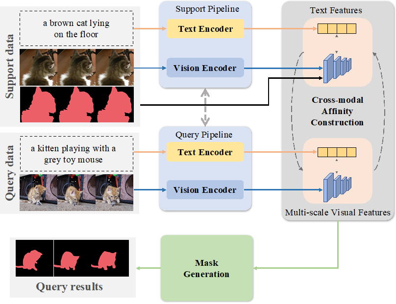 当前深度学习参考视频目标分割(RVOS,Referring Video Object Segmentation)已有工作都要求特定场景具有足够丰富的文本及视频多模态联合标注数据。但在缺乏标注数据的新应用场景,以较低成本实现多样化视频有效目标分割是一个迫切需要解决的问题。团队基于Transformer架构,提出了一种跨模态少样本亲和力学习的新方法,根据少量样本建立多模态亲和关系,为多样化的数据学习新的语义信息;首次构建了的FS-RVOS(Few-shot RVOS)基准,在只有少量标注样本的情况下,采用交叉注意力方式分层融合视觉和文本特征以获得特定类别的鲁棒特征表示,为最终实现真实陌生场景参考视频目标分割指明了方向。