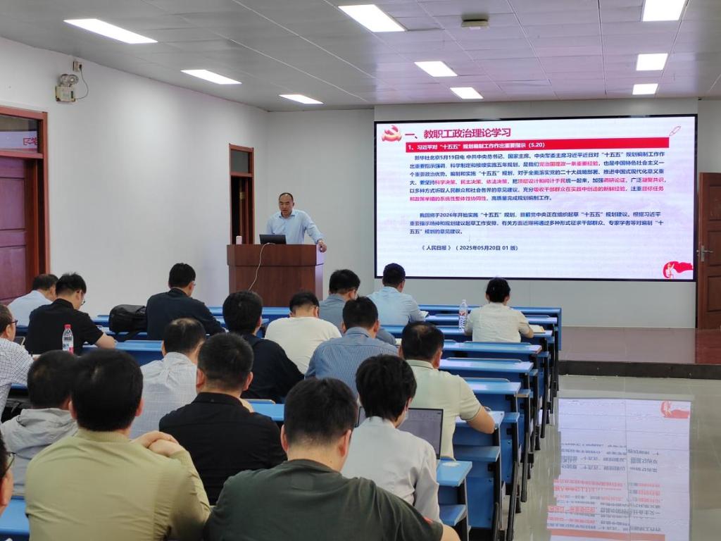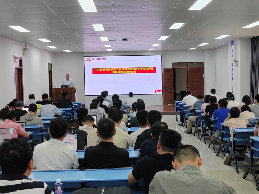 会上,夏玉钦带领全体教师学习了习近平总书记对“十五五”规划编制工作作出的重要指示和习近平总书记重要文章《加快建设教育强国》;传达学习了中央层面关于严重违反中央八项规定精神典型问题的通报和6月1日安徽省委常委会会议精神等。组织学习了校第五次党代会的主要精神,通报了学校近期的重要事项和重要成果,学院前期的重点工作和取得成效。通报了中共安徽省委教育工委安徽省教育厅关于高校师德违规典型问题案例。