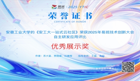 5月22日至26日,由教育部易班发展中心主办的2025年全国高校易班技术创新大会在广东省珠海市胜利召开。来自全国100余所高校的400余名师生齐聚一堂,围绕网络思想政治教育与技术创新展开深入交流与展示。大会集中评比了高校在易班平台应用与开发方面的技术成果,我校计算机科学与技术学院报送的作品《安工大一站式云社区》荣获自主研发应用评比优秀展示奖。