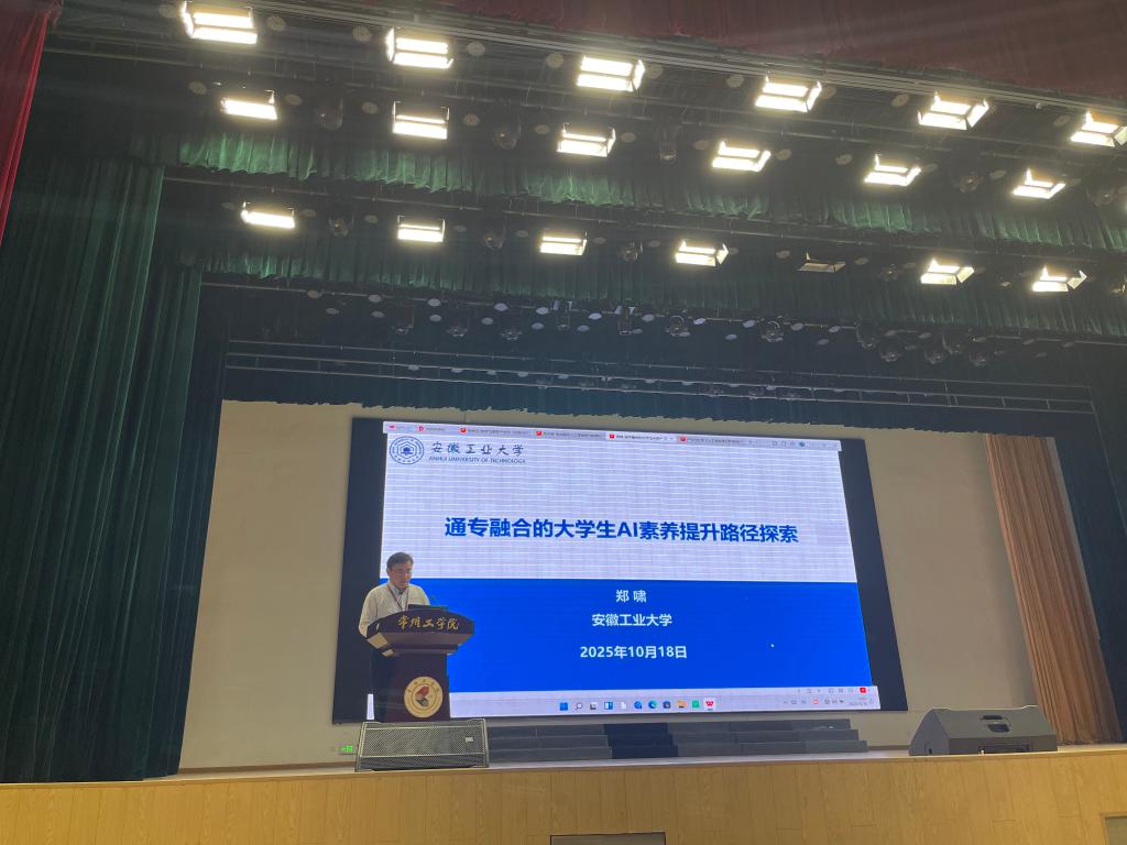 10月18日,第二届应用型高校人工智能通识教育教学改革与创新研讨会在常州工学院举办,副校长郑啸教授率计算机学院、管工学院、机械学院等教师参会,郑啸教授并作了《通专融合的大学生AI素养提升路径探索》主旨报告。郑啸从我校人工智能通识课改革入手,以“AI通识课+微专业”赋能新质人才培养为主题,介绍了我校人工智能通识课改革的建设举措及成效。