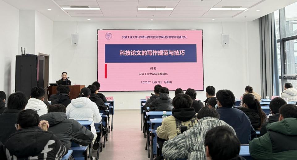 夏玉钦首先向出席论坛的专家、评委和师生代表表示欢迎和感谢。他指出,研究生学术创新论坛是学院精心打造的学术品牌,也是人才培养的重要平台。他鼓励同学们珍惜机会,希望大家能够立足国家战略需求,聚焦计算机学科前沿问题,将论文写在祖国大地上,把研究做在产业需求处,充分展示研究成果,在科研道路上脚踏实地,努力取得更多高质量的学术成果。随后,《安徽工业大学学报(自然科学版)》常务副主编何莉老师应邀做了题为《科技论文的写作规范与技巧》专题讲座,围绕科技论文的结构、写作要点与常见问题,为在场研究生提供了系统详实的指导。