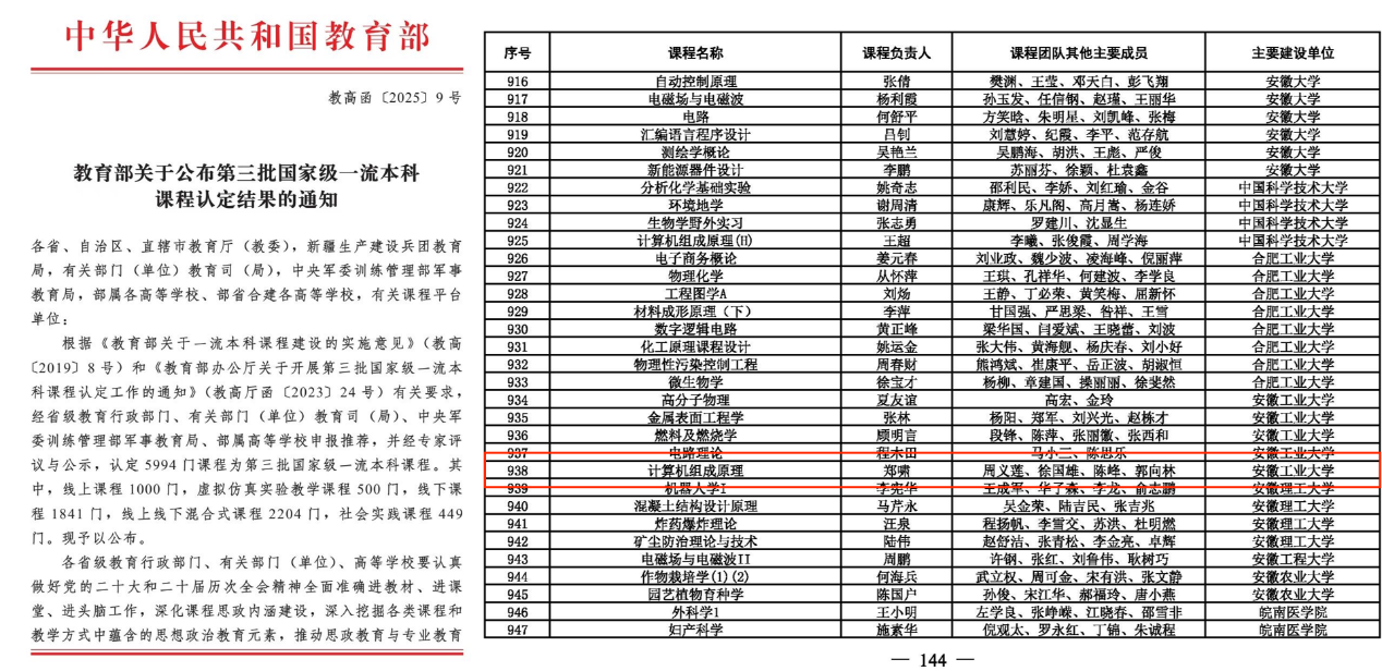 日前,教育部印发《教育部关于公布第三批国家级一流本科课程认定结果的通知》(教高函〔2025〕9号),副校长郑啸主持的《计算机组成原理》被认定为国家级线下一流课程,实现学院的新突破。我院国家级一流本科课程已达4门,数量位居学校前列。