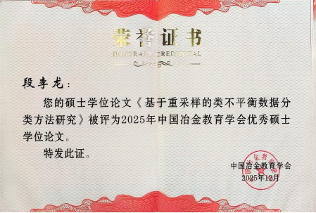近日,中国冶金教育学会公布2025年优秀学位论文评选结果,我院2024届硕士生马晓峰(导师:周建平)和段李龙(导师:薛伟)的硕士学位论文获评优秀硕士学位论文。中国冶金教育学会是隶属于教育部的国家一级学会。“中国冶金教育学会优秀学位论文评选”由学位与研究生教育分会组织开展,旨在加强高层次创新型人才的培养工作,提升全国冶金院校研究生培养质量和学术水平,培养和激励研究生的创新精神。
