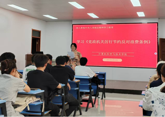 为深入贯彻中央八项规定精神学习教育,弘扬中华民族勤俭节约的传统美德,6月13日,计算机科学与技术学院举办“厉行勤俭节约反对铺张浪费”主题教育活动。学院新发展的全体党员参会,活动由团委副书记林颖主持。