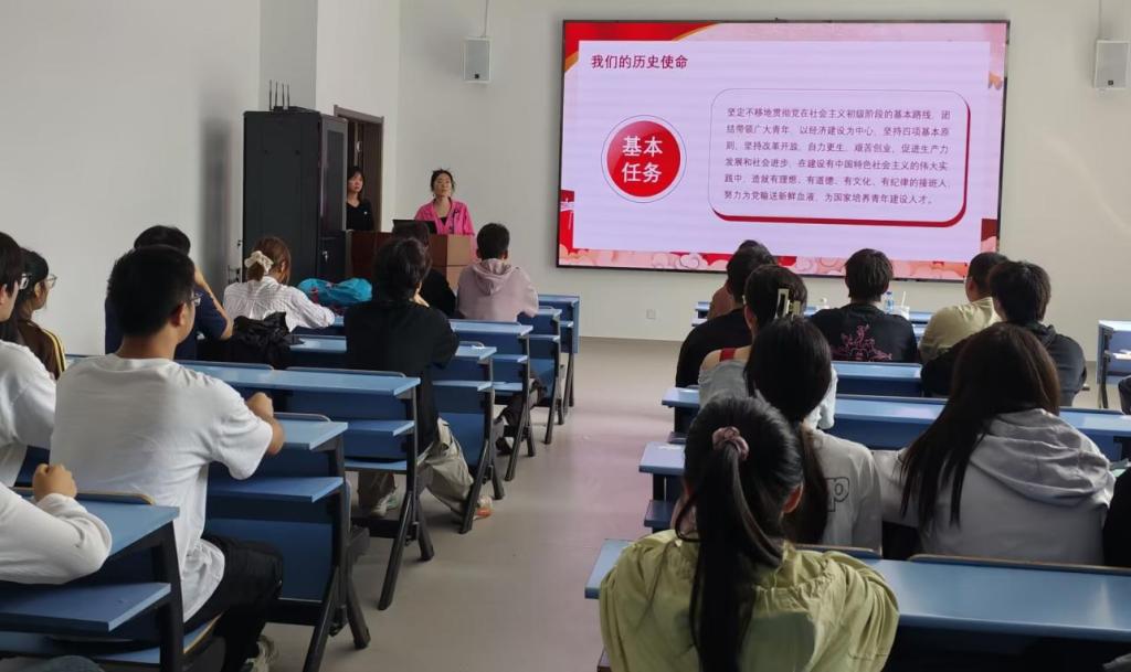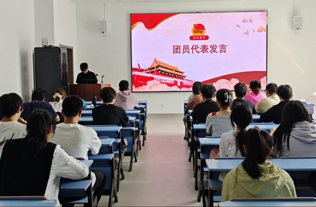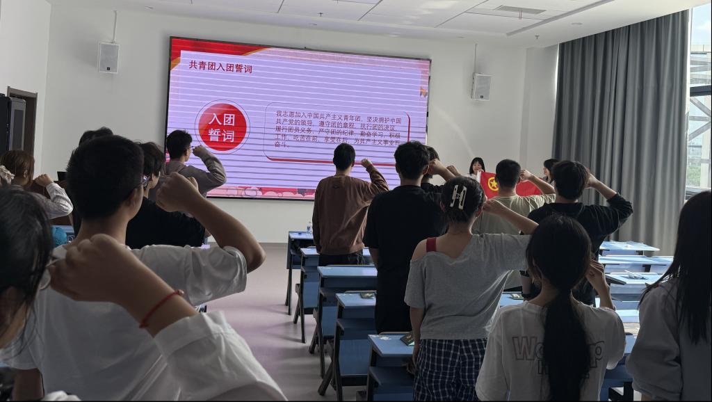 仪式在庄严的国歌声中拉开帷幕。学院分团委副书记侯皖婷宣读了新团员名单,此次共有24名新团员通过层层筛选加入共青团。随后,由优秀团员代表为新团员颁发并佩戴团徽和团员证。在团旗前,新团员们举起右拳,庄严宣誓。铿锵有力的誓言回荡在会场,表达了同学们坚定的理想信念和为共产主义奋斗终身的决心。